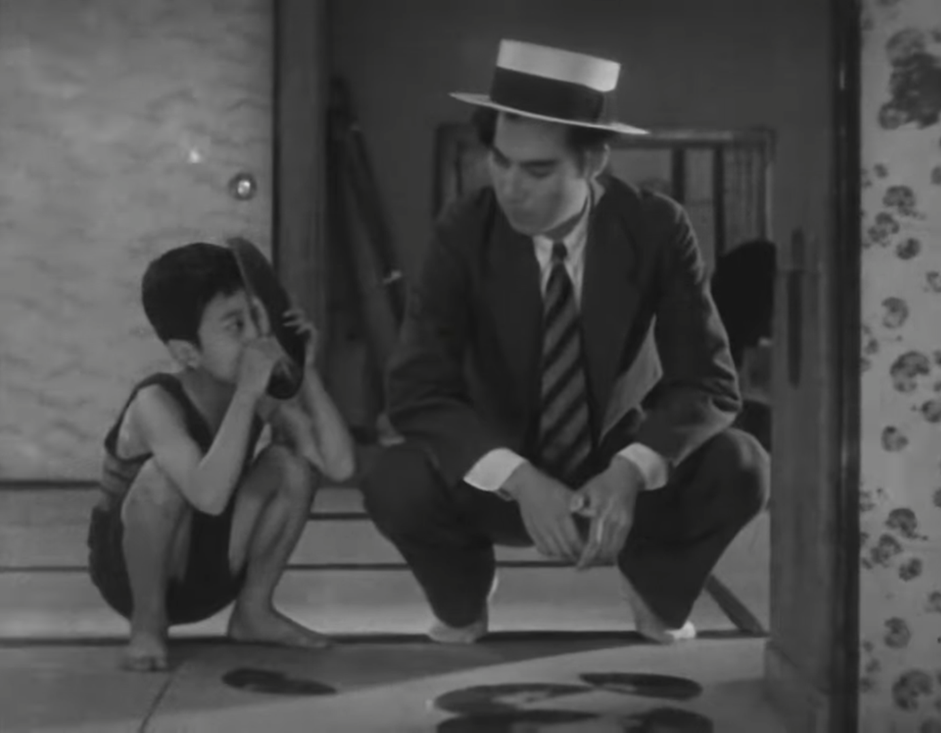 Ce que nous appellerons le gag du vinyle se présente comme ceci: après avoir joué au ballon avec sa sœur, on retrouve le fils les pieds en pointes sur un tabouret chancelant. Il essaye de récupérer le ballon qui s’est niché au-dessus d’une armoire où se trouve, sur le bord droit, un empilement de vinyle. Son père finit par le rejoindre et voit que le petit fait tomber les disques. Il les remet à leur place et essaye à son tour de récupérer la balle, les faisant ainsi retomber. Sauf que cette fois, ils se cassent. Un plan montre le père et le fils symétriquement prendre deux moitiés de vinyles. Mais alors que le premier repose avec résignation le disque brisé, le fils se sert d’une moitié comme des lunettes pour le regarder, ricanant de sa trouvaille. On assiste encore à une temporalité nouvelle qui fait dériver le récit, qui apporte une strate supplémentaire au lieu de se cantonner à la colère du père face aux bêtises de son enfant. Ozu y infiltre un moment d’invention, un moment où le vinyle est braconné. Le corps de l’enfant devient l’intermédiaire de percées utopiques de et dans l’image, quelque chose qui dépasse finalement la hiérarchisation des âges pour débattre avec le réel dans cet espace commun du regard et des corps qu’est le film.