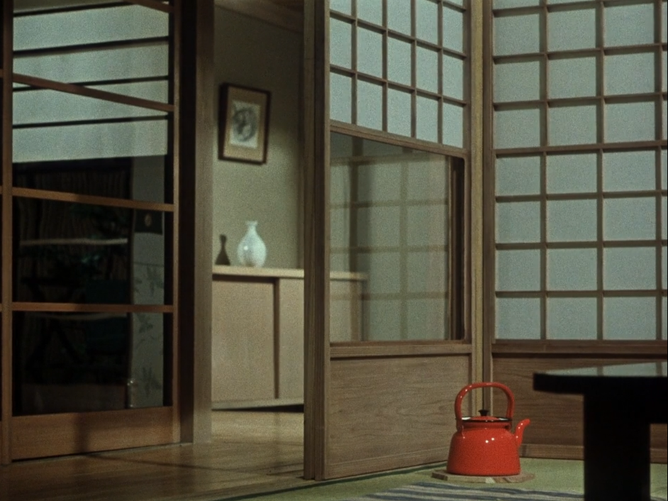 Cependant quand je pense à cette intense émotion de l’ici-et-maintenant, c’est avec un objet précis en tête. Pour vous dire vrai, il y a peu de jours où la théière rouge de Fleurs d’Équinoxe ne me traverse pas l’esprit. C’est peut-être parce qu’Ozu n’y a laissé de la signification que l’intensité de montrer. Il ne nous a laissé que le plus intense des actes de présence. Elle apparaît au premier plan de la quatrième séquence du film, celle qui nous introduit au foyer des protagonistes. Elle attire tout de suite notre regard avec son rouge éclatant parmi les couleurs plutôt ternes du reste du plan. Disparaissant de la séquence jusqu’à ce que le père rentre chez lui, elle revient quand la femme de ce dernier traverse la salle de vie pour aller lui ouvrir, au fond à gauche du plan. Une fois dans l’entrée, on la voit en bas à droite. Enfin, de retour dans la salle de vie, elle est soudain déplacée dans le hors champ par la fille cadette afin d’aller servir le thé à son père. C’est d’une banalité confondante. La théière est posée là jusqu’à ce qu’elle soit utilisée normalement. Pourtant on sent qu’on ne peut en rester là, car cette théière en périphérie de l’intrigue parasite notre regard qui voudrait naïvement voir le film défiler devant lui. On n’aimerait pas avoir à regarder dans les coins de l’image ce détail si voyant, si rouge. Sa disparition la rend encore plus troublante, car elle confirme qu’il y avait dans cette théière un enjeu de présence, un enjeu du regard. Cet enjeu est reproduit à plusieurs reprises dans le film, comme lors de la séquence de repas final dans la maison où le plan de coupe inaugural de la quatrième séquence est répété. Cependant la théière n’y est plus, car elle est maintenant devant la table pendant que les femmes de la famille mangent ensemble. Si Shigehiko Hasumi nous rappelle que le repas est un moment fondamental du cinéma d’Ozu, la présence de la théière rouge ne peut que l’intensifier, car elle y ajoute l’émotion de la présence de ce signe là, ici, maintenant. George Didi-Hubermann décrit ainsi l’effet de pan du fil rouge dans La dentelière de Vermeer: