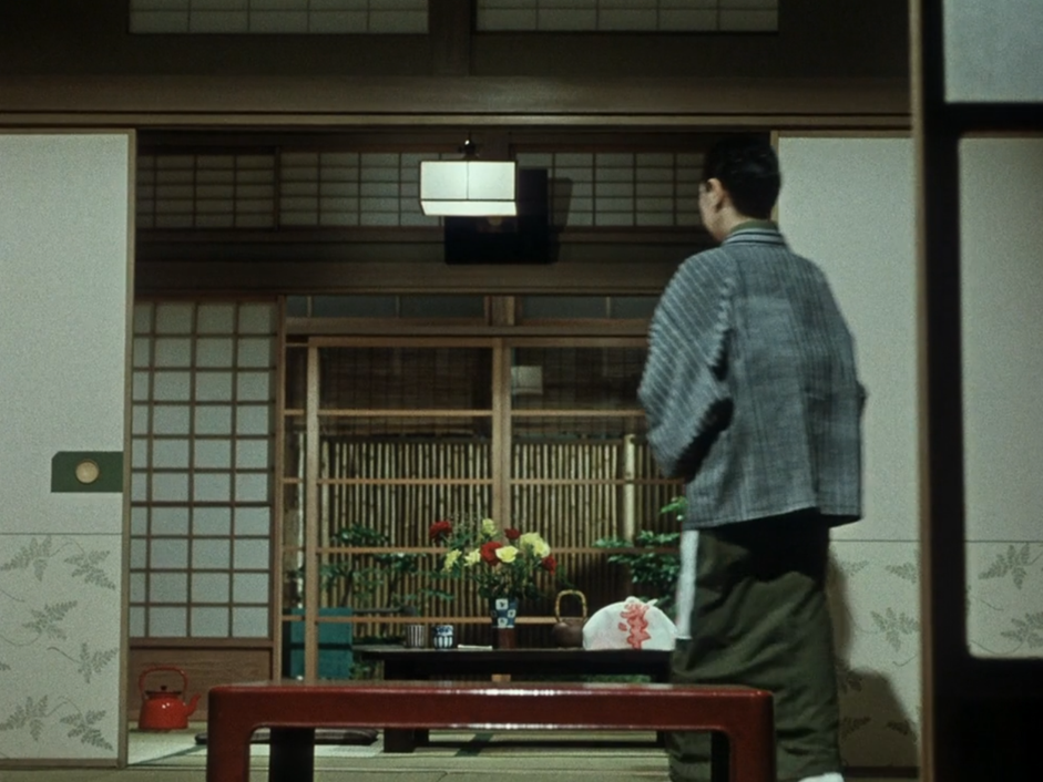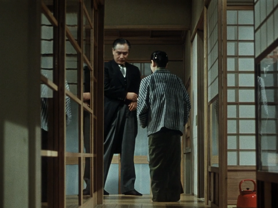 Chez Ozu, les clefs semblent avoir déserté les lieux. On n’a par exemple jamais vu de personnage tenter de s’emparer d’une clef mystérieuse comme dans Notorious. Cela veut nécessairement dire que les portes s’ouvrent et se ferment sans résistance mécanique, car aucune porte scellée ne dissimule de mystère nécessitant une clef particulière. Est-ce à cause de cela que, dans Chœur de Tokyo, le fils aîné du protagoniste déchire le papier des shōji en guise de protestation contre la pingrerie de son père ? La porte, libérée de son statut signifiant d’obstacle, peut retourner à une matérialité plus libre, qui n’en demeure pas moins signifiante. C’est justement parce que cette matérialité se manifeste en tant que signifiant, en tant qu’image pensée en relation avec d’autres, qu’on peut proclamer qu’elle est libre. Cette image de l’excès détourne la fonction de la porte comme obstacle du récit pour ouvrir ce dernier au temps propre de ce qui n’était avant qu’une étape : le monde des objets, ce qui se donne au toucher, à la palpation, à l’invention. Les films d’Ozu n’ont cessé de penser la relation avec ce qui est généralement considéré comme périphérique.