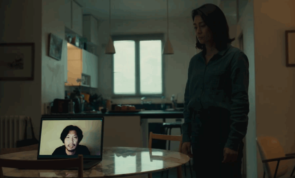 Kurosawa a réalisé le moyen et le long-métrage quelques semaines avant Cloud3, enfin il n’y a pas eu de correction mais plutôt une variation. La chaîne de travail de Chime retrouve un malaise familial dans l’artifice social du domicile, et la folie zélée du chef-cuisinier à ses fourneaux reflète donc celle de son épouse dont les tâches ménagères deviennent de plus en plus mécaniques jusqu’à en dérailler ; la caméra de l’entrée, qui produit ce léger carillon étrangement familier, sonne l’interruption de la chaîne lorsque toute la famille disparaît de la surveillance. La virtualité des objets dans La Voie du serpent marque enfin l’objet du couple même. Par rapport au film original4, Kurosawa y gagne en distance lorsque le personnage du professeur est remplacé par celui de la médecin, toujours aussi mystérieuse mais surtout isolée dans un Paris invisible et haussmanien. Ses consultations sont plus robotiques encore, son travail domiciliaire est automatisé (on filme assez longuement la figure presque surnaturelle de l’aspirateur-robot), son couple est numérisé par les nombreuses visioconférences qui parsèment et clôturent le film. La division entre le travail professionnel et le travail domiciliaire ne poursuit qu’une réalité dans laquelle le couple n’existe plus qu’en tant que travail. L’outil virtuel correspond alors à cette division quand elle apparaît comme aliénation dans sa distance matérielle.