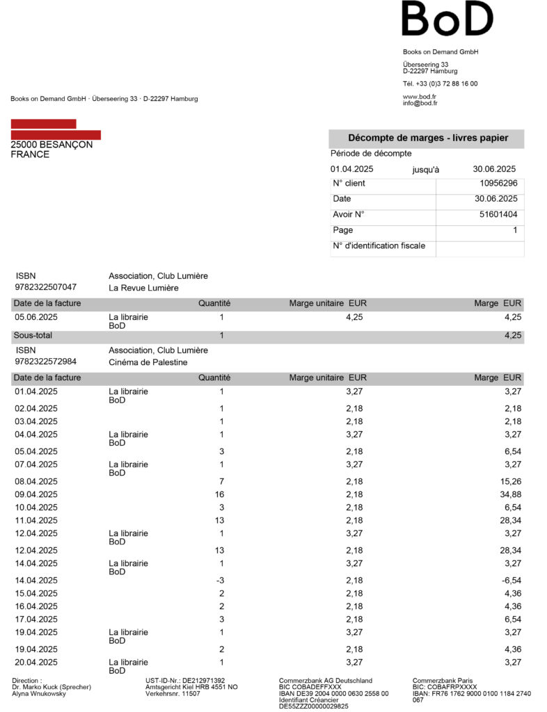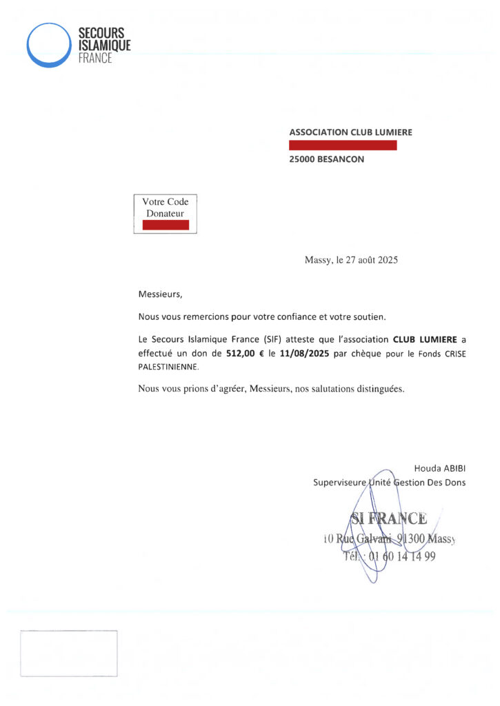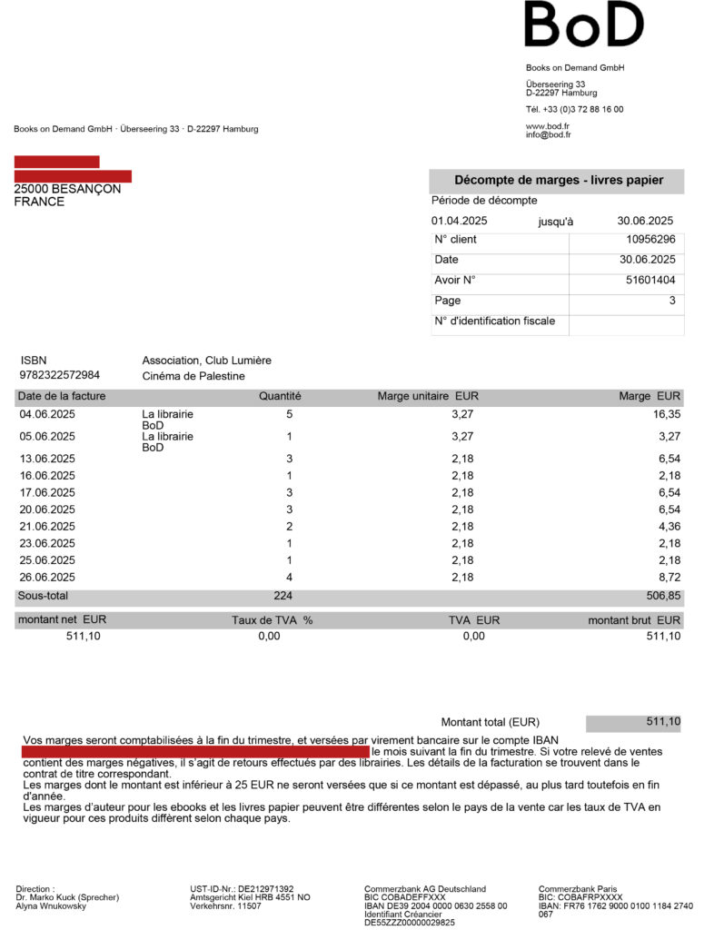 Le mois de juin affiche 36 ventes pour une marge de 87,09€ (Document 6). Pas de bug d’affichage cette fois-ci ! Les ventes commencent à diminuer mais continuent à se faire. Cet argent s’ajoute à celui du mois d’avril et de mai et donne un total de 511,10€, montant qui figure donc sur le décompte trimestriel de BoD (Documents 7a et 7b et 7c). Nous avons envoyé un second chèque au SIF, ici de 512€. Ce don a bien été reçu et enregistré pour le “Fonds Crise Palestinienne” (Document 8).
