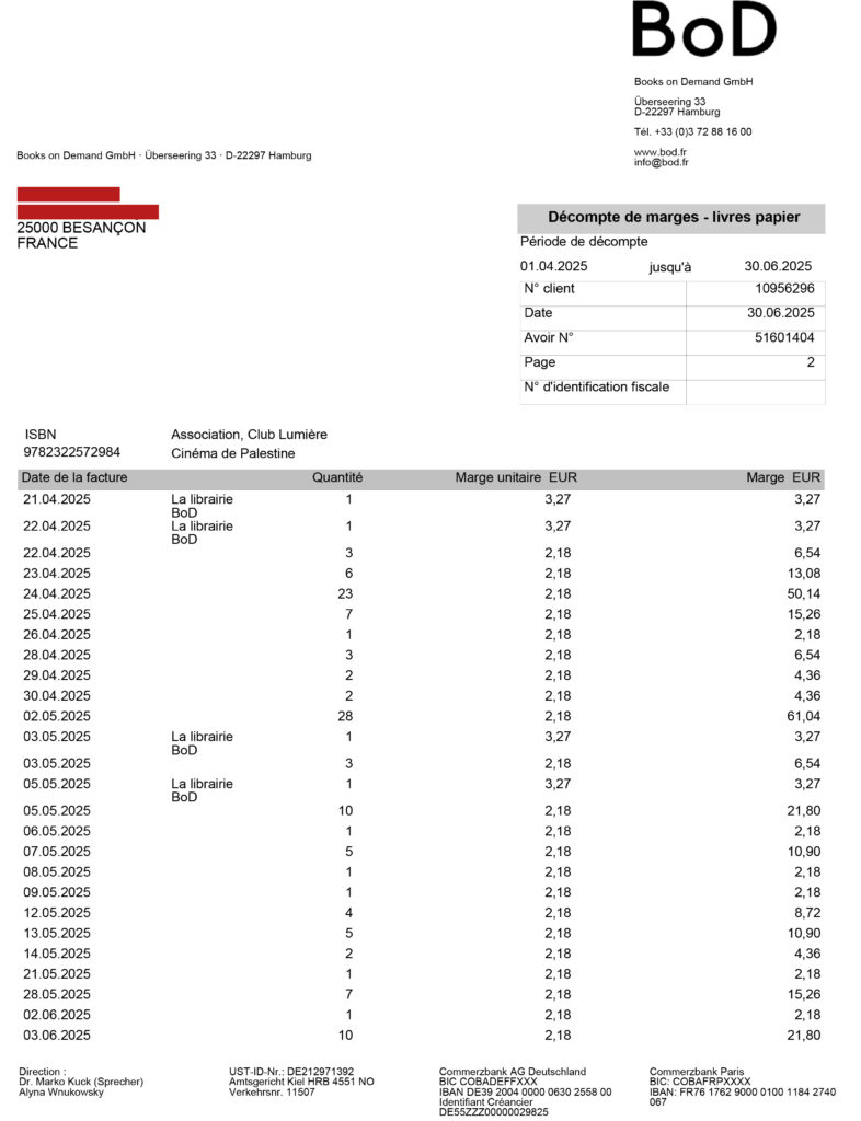 N’ayant pas encore trouvé de moyens plus éthiques, la seule fois où nous avons eu à publier un livre (La Revue Lumière en décembre 2023), nous avons été utilisateurs et clients du site internet BoD(.fr). Pour cette nouvelle publication, nous avons procédé de la même manière. Books on Demand (BoD) est une plateforme d’auto-édition européenne ayant son siège social en Allemagne. Il s’agit ici d’impression à la demande, ce qui dans le cas de notre petite association permet de ne pas avoir à avancer de fonds en vue d’une précommande. Nous sommes également quittes d’avoir à gérer un stock et des envois. Autre gros avantage, leurs services incluent l’attribution d’un numéro ISBN (International Standard Book Number) et le référencement de nos ouvrages dans des bases de données permettant la vente de ces derniers via de nombreux distributeurs. Voici la raison pour laquelle vous pouvez vous procurer Cinéma de Palestine sur des sites tels que Amazon, la Fnac, Cultura, ex libris, etc. Tous les aspects de cette technique ne raisonnent pas forcément avec nos valeurs, cependant les services qu’offrent BoD nous permettent finalement de pouvoir publier nos livres et qu’ils soient accessibles au plus grand nombre. Solution sans doute temporaire, mais qui pour le moment nous permet d’accéder au monde de l’édition.