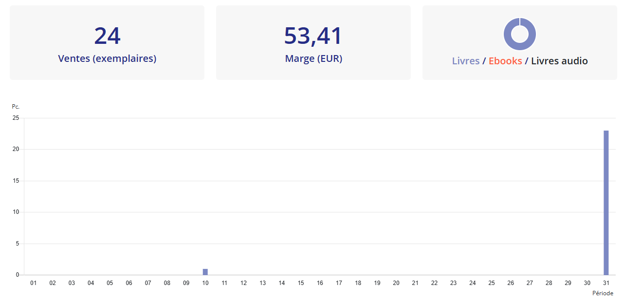 Le mois de juillet a abouti à 24 ventes pour une marge de 53,41€ (Document 9). Pas de bug d’affichage cette fois-ci non plus, seulement des ventes moins nombreuses et moins fréquentes, ce qui s’explique car le livre est maintenant publié depuis plusieurs mois ! Comme pour le trimestre dernier, cet argent s’ajoutera donc à celui du mois d’août et de septembre et sera envoyé lors du prochain décompte de BoD.