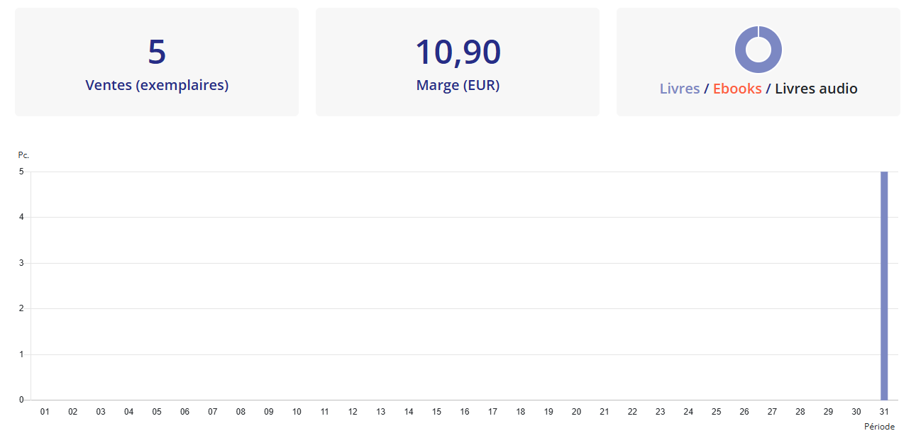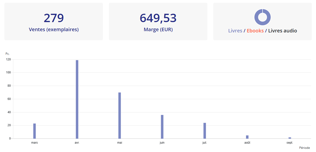 Le mois de mai comptabilise 70 ventes pour une marge de 154,78€ (Document 5). Comme pour le mois précédent nous avons un problème d’affichage : les ventes se sont encore une fois étalées sur le mois entier et non pas seulement le 31. Cet argent s’ajoutera à celui du mois d’avril et de juin et sera envoyé lors du prochain décompte trimestriel de BoD.
