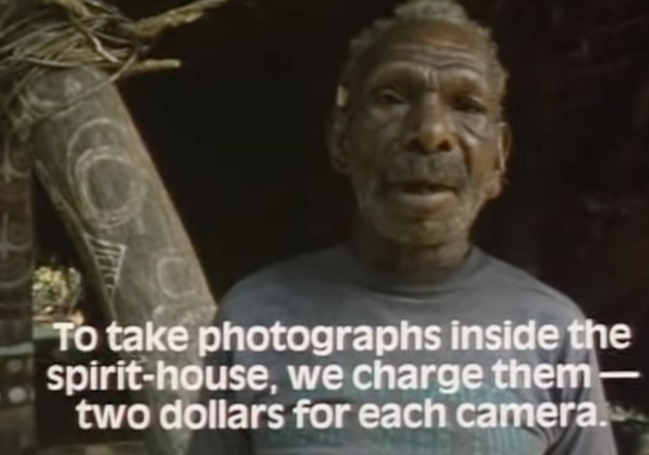 Cette mélancolie d’un éden colonial qui pourrait apparaître ambiguë pour un esprit premier degré est ridiculisée et retournée contre elle-même par les interviews des papous qui ne sont pas dupes de leur nouveau statut économique de subordonnés apporté par l’économie du tourisme. Autrefois désirés pour leur force de travail comme à l’époque ancienne montrée par les photographies d’archives où ils sont entourés de colons ou d’officiers militaires, ils sont cette fois valorisés par l’exotisme qu’ils renvoient aux touristes. Cet exotisme se mesure alors par une valeur monétaire. Les touristes doivent payer deux dollars pour  rentrer dans la maison sacrée des esprits et prendre des photos.