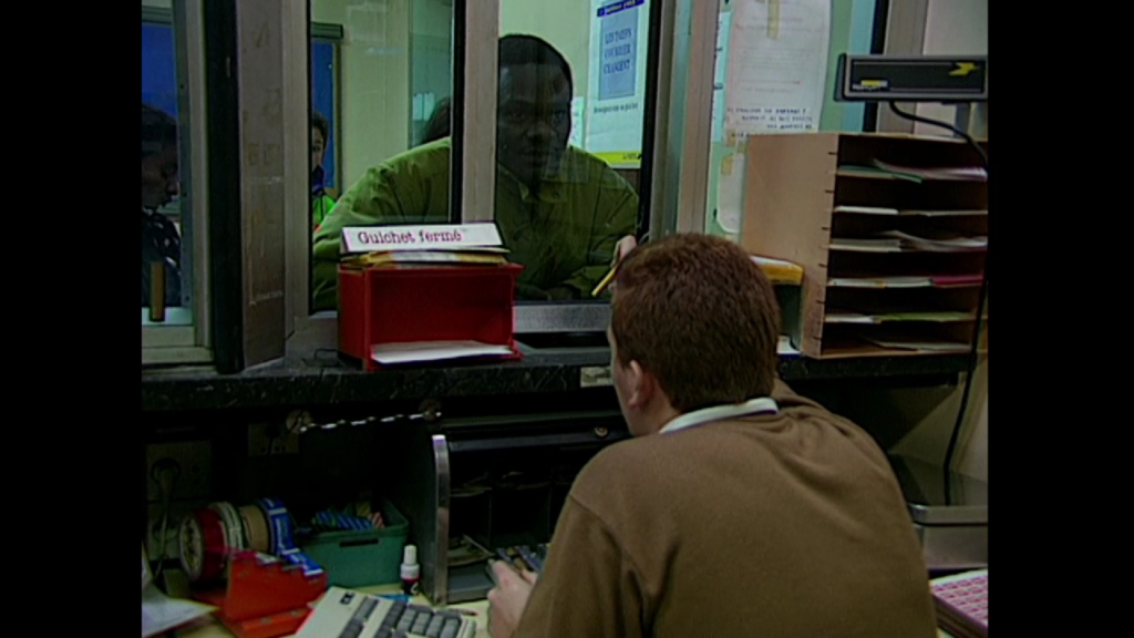 Suite de discussions entre collègues, entre clients, entre guichetiers et clients, entre la caméra et toutes ces personnes qui naviguent dans ce lieu codifié où chacun joue son rôle. Les clients râlent, se plaignent du temps que cela prend, les guichetiers soupirent, lèvent les yeux au ciel, cela fait partie du jeu social que le bureau de poste impose. Et c’est ce jeu social qui est capté assez brillamment par le film, avec un regard partagé entre clients et postiers, d’un côté et de l’autre du guichet, qui passe des uns aux autres comme des rimes enlacées, ce qui permet de réunir toutes les personnes filmées au lieu de les opposer, de créer un antagonisme par le montage. De fait, bien que cet espace soit un espace d’échange tel que je l’ai décrit, l’architecture du lieu joue plutôt la séparation, imagée par les vitres qui sont officiellement une barrière protectrice pour les guichetiers, qui rendent les rapports oraux compliqués, qui les engluent, les alourdissent. Les postiers eux-mêmes sont contre mais ce n’est pas entre leurs mains, ils sont forcés à la distance imposée par cette frontière qui coupe l’espace de la poste en deux. Les postiers jouent d’ailleurs un rôle très particulier : ce sont de petits employés qui effectuent ici un travail alimentaire, ils sont en bas de l’échelle sociale et sont confrontés à des personnes et des situations de vie plus miséreuses que la leur. Ce sont eux qui représentent l’Etat dans cette situation et qui font face à une misère parfois assez profonde. La complexité de leur position se ressent dans la manière dont la caméra capte leurs comportements, parfois très humains et bienveillants avec les personnes dont ils s’occupent, parfois plus désagréables, hautains lors des heures de pointe et que la lassitude se fait sentir. Il y a cette forme de double-jeu comportemental où la structure, la volonté d’aller au plus vite, rompt la bienveillance naturelle, où l’exercice de leur travail les rend par moment anempathiques ou colériques, dans un jeu de miroir avec les clients qui eux aussi perdent leurs nerfs face à des files d’attentes interminables, occasionnant des échanges colériques parfois captés par la caméra.